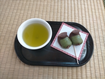 お茶付きで名物の福太郎という草餅を食べました。先ほどの腰掛石を表しています。